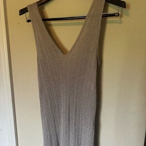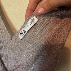Sleek, minimal, and effortlessly elegant — this metallic ribbed knit top from ZARA is a true statement piece. Designed with a deep V-neckline, soft stretch fabric, and a twisted front detail that flows into a dramatic longline silhouette, it pairs beautifully with trousers, skirts, or heels for a chic, elongated look.