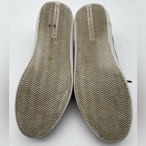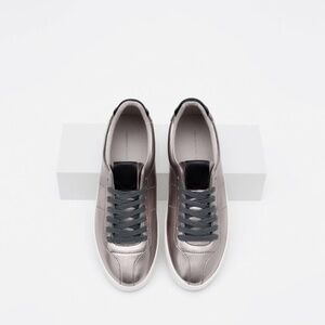 Flat silver coloured shoes with contrasting black details on the tongue and the back of shoe and contrasting white sole.