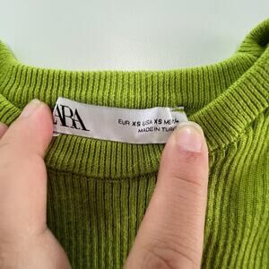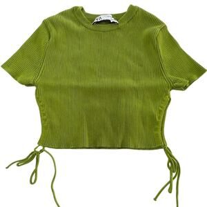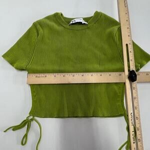 Zara Shirt Womens XS Green Ribbed Short Sleeve Side Tie Stretch Cropped Top