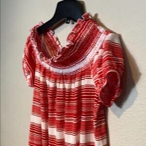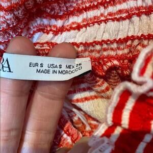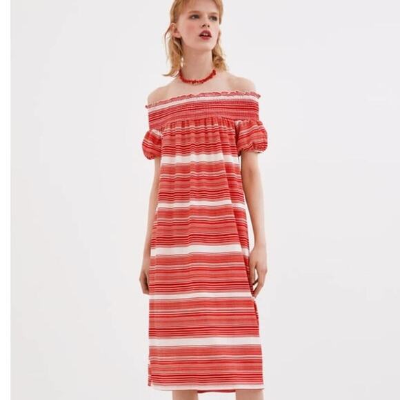 Brand new Zara Striped Shirred Short Sleeve Dress Red White Size Small. Wide shirred neckline and short sleeves with shirred cuffs. Measurements: top of shoulder to hem