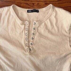 Zara Short Sleeve V-Neck Snap Front Beige Tee T-Shirt Cropped Size Small