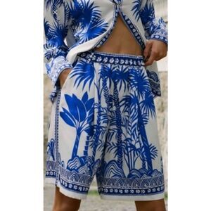Zara Shorts Size XS White Blue Bermuda Printed Elastic Waist High Rise Belt Loop