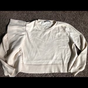 Looking your best has never been easier than with this great Zara sweater with fun side ruffle that looks just as perfect dressed up or down. Roomy fit and boxy cut means this size small will work on just about everyone! Some pilling throughout body and sleeves as pictured- not so noticeable when you are wearing it and will likely come off with a short session with your sweater shaver. Approximately 18 inches long and 21 inches across at the armpit.