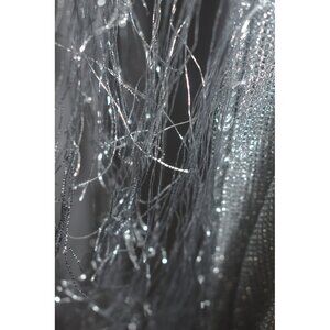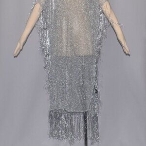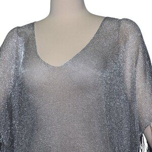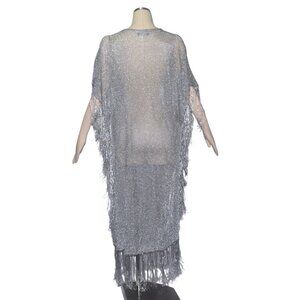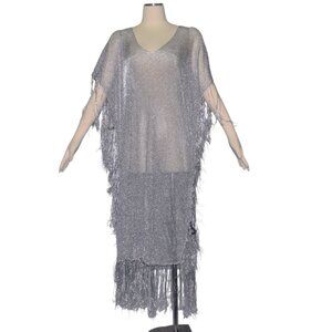 Great metallic silver caftan! Knit crochet with fringe at edges. Size medium. Length including fringe approx. 50 inches. Some of the fringe pieces show fraying. Otherwise nice gently used condition.
