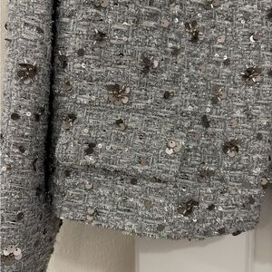 Chic Zara blazer with shimmering sequins. Elegant tweed texture. Perfect for stylish occasions.