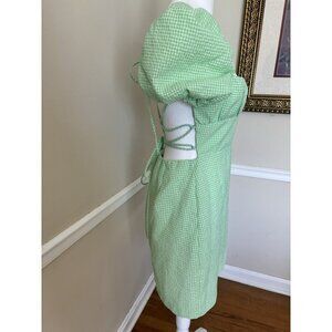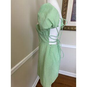 Zara Size L Green White Gingham Lace Up Back Puff Sleeve Mini Dress Seersucker