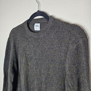 Zara Size M Black Green Waffle Knit Crew Neck Pull Over Sweater Cotton Grandpa