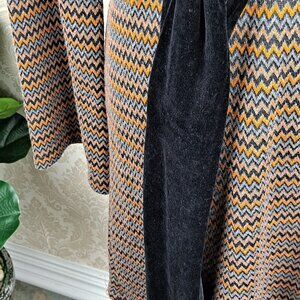 This sheath dress has a chevron striped pattern in orange, gray and black. Mock neck. Belt loops are attached in the same material and a black velvet belt is included (but could easily be swapped out for a different belt). Long sleeves have a slight flare to them at the ends. Hidden back zipper. 70's with a modern twist.