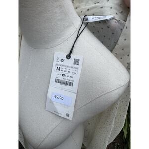 This is a Zara women's button-up top in size Medium. It features a polka dot pattern and is designed in a tunic style with an oversized fit. The top is made of a semi sheer fabric, creating a flowy and comfortable look. Perfect for a casual yet stylish outfit. Please refer closely to pictures and feel free to reach out to me with any questions: