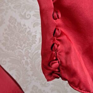 This beautiful red dress has a lovely sheen to the fabric. Featuring a v-neck that leads to covered buttons going down the bodice and long sleeves with button details on the wrists. There is a button on the inside of the skirt for security and then a self tie at the waist. There is one small pull in the material on the left shoulder - please see pics.