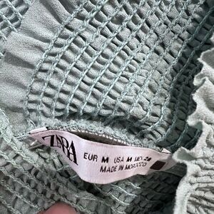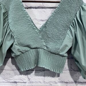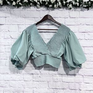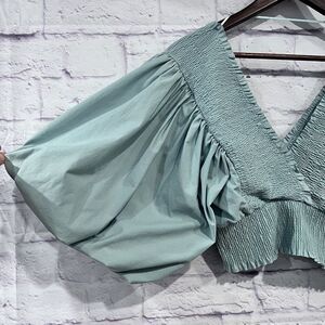 Zara Size Medium Teal Puff Ballon Sleeve V Neck Ruched Cropped Top Stretchy