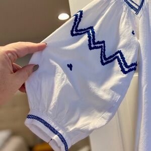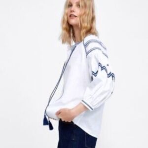 Boho-inspired oversized blouse from Zara, size small. Features beautiful blue embroidered details and tassels, long puff sleeves, and a round neckline with a V-neck opening. Made from a comfortable cotton and linen blend, this blouse is perfect for adding a relaxed, chic vibe to your wardrobe. Note: There is a slight stain on the back right sleeve that is barely noticeable and may come out with a good treatment. A unique and stylish Zara piece!