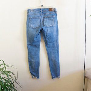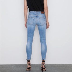 The Skinny Multidamage in Azure Blue from Zara. Mid rise jeans with five pockets. Washed effect. Front ripped detail and frayed hem. These jeans look so good on, and fit me so well! But I'm downsizing significantly, and selling most of my clothes.