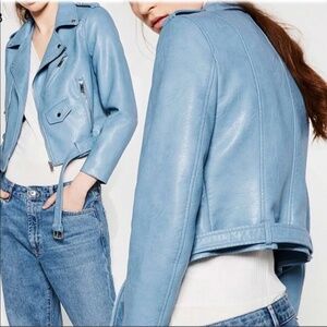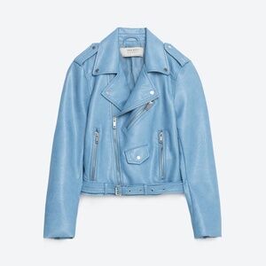 Chic sky blue leather jacket. Features asymmetrical zip and snap details. Ideal for trendy outings.