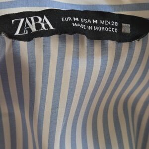 Chic wrap blouse with sky blue stripes. Offers a modern fit and stylish look. New. No tag.