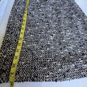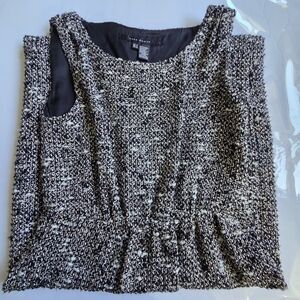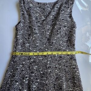 This elegant black and white dress with gold yarn accents is perfect for day and night occasions. Its classic design offers a timeless look. Ideal for both casual and formal events.