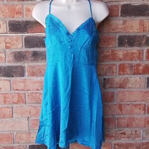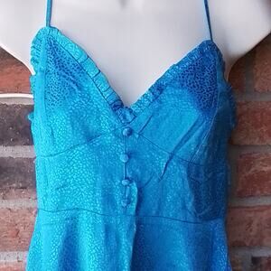 This silky feeling lightweight dress is unique featuring an electric blue/Aqua color with metallic embroidery creating a leopard print type pattern. The dress has a simple ruffle trip around the upper hem of the chest and back, hidden side zip, small accent buttons, and spaghetti straps (not adjustable).