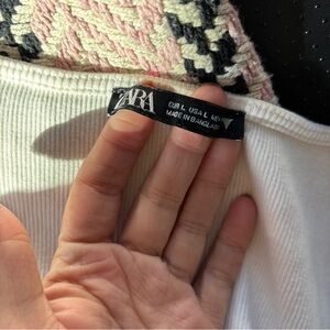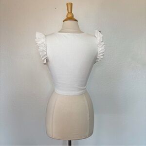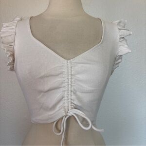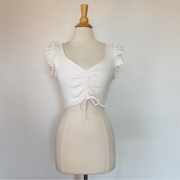 Zara Solid White Ruffle Sleeve Ruched & Ribbed Crop Top. Size Large, no material tag. Has discoloration under arms. Stretchy. 3.7 oz
