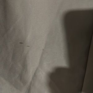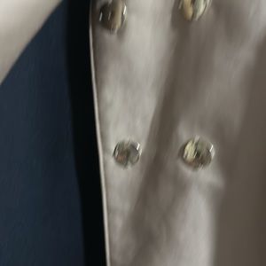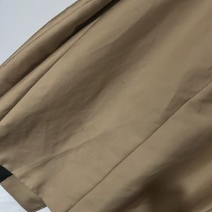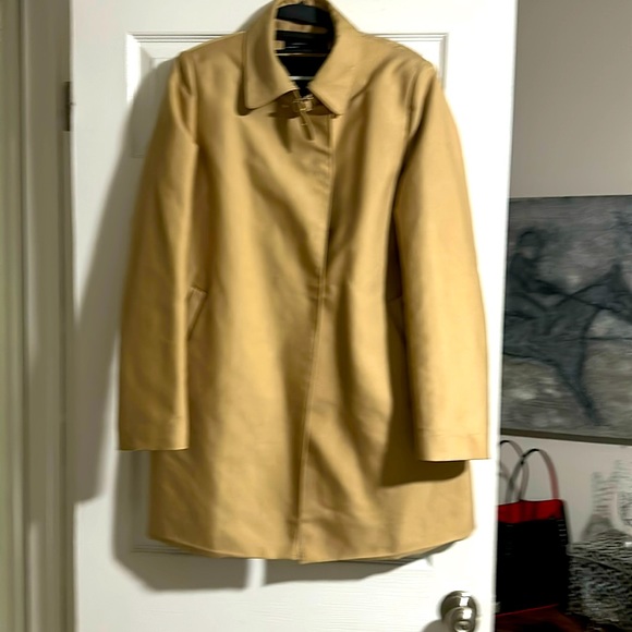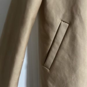 Fingertip length cotton sateen coat in khaki. Practically new but three small spots on back.