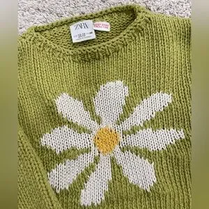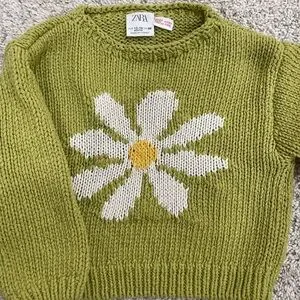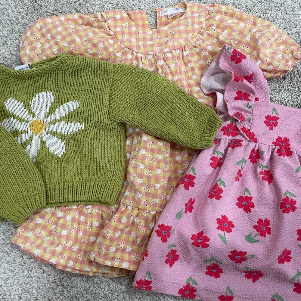 Charming baby dress with pink and yellow checkered embroidered pattern. Features delicate white floral accents, yellow daisy knit green sweater and pink ruffle dress. Sizes in photos!