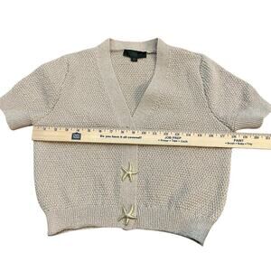 Textured knit cardigan. Starfish shaped metallic buttons. Short sleeve. Lightly cropped.