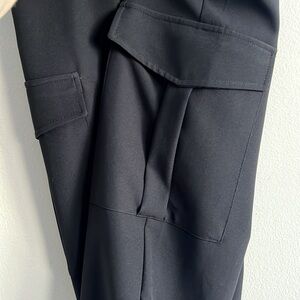 Pull on black cargo trousers. Elastic waistband on back, decorative silver front button (does not unbutton, no zipper), functional size cargo pockets with flaps.
