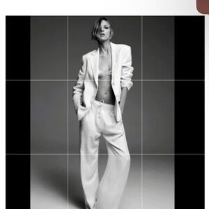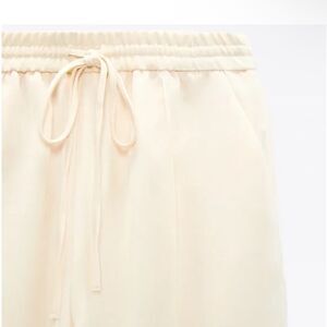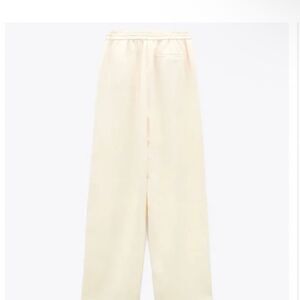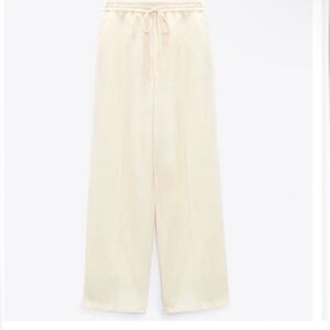 High-waisted trousers. Adjustable elastic waistband with ties in matching fabric. Side in-seam pockets. Wide-leg design. Color: Ecru