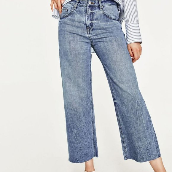 Ice washed straight leg 5 pocket denim with raw hems. Cropped length.