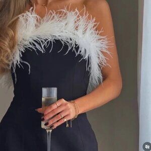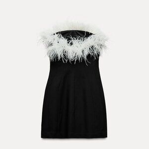 Strapless stretch fabric short dress with straight neckline. Feather appliqué. Matching interior lining. Hidden zip closure at side.