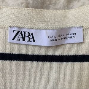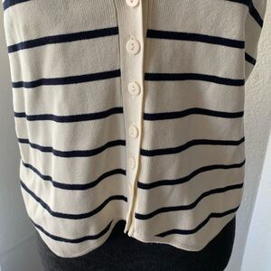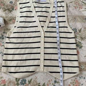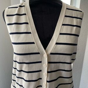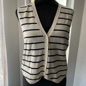 Classic Zara striped sweater vest in ivory and navy. Features button front closure and sleeveless knit design, perfect for layering. Size Large. Preppy, nautical, and coastal-inspired—ideal for capsule wardrobes and Parisian chic styling.