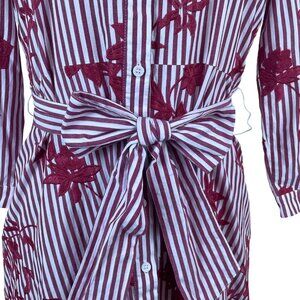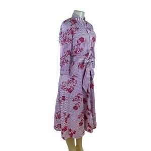 This Striped Floral Polyester Blend Midi Dress features a button-front closure, a tie waist for a flattering fit, and 3/4-length sleeves. The red floral embroidery on a white striped background provides a striking design. Made from a soft and breathable polyester blend.