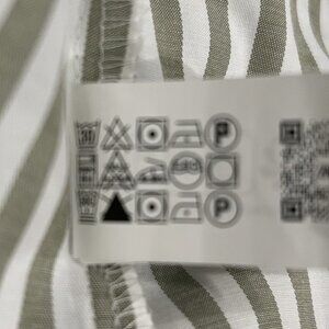 Zara button down, size MEDIUM, green and cream colored vertical stripes, three buttons at each end of sleeve, 58% polyester, 42% cotton, machine washable, excellent condition, never worn, smoke-free home, wear open with a tank, unbutton bottom two buttons and tie ends at waist, wear tucked in or out, versatile, comfortable.