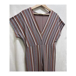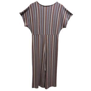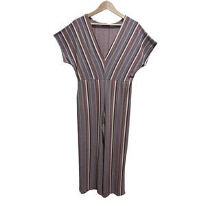 Zara Striped Jumpsuit L V Neck Earth Tone 70s Brown Rustic Wide Leg Boho Indie Chic.