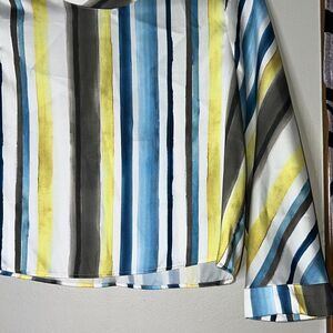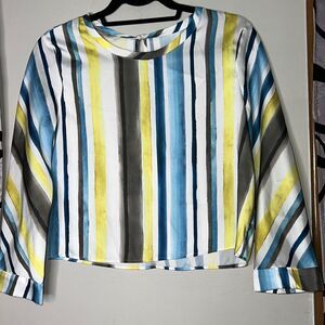 Zara Striped Long Sleeve Cropped Blouse Medium. Back neck button and keyhole closure, wide sleeves. Yellows, blue white and gray stripes. Gently used condition with no visible flaws.