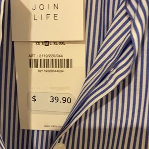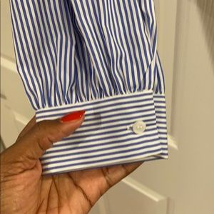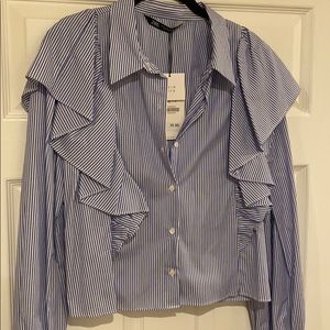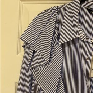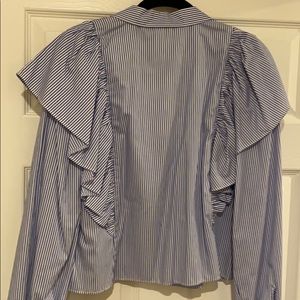 Long sleeve, striped (blue and white), button closure, and ruffle detail (at shoulders and down front/back panels).