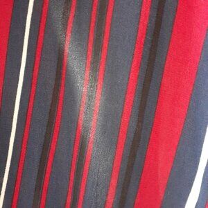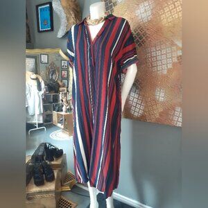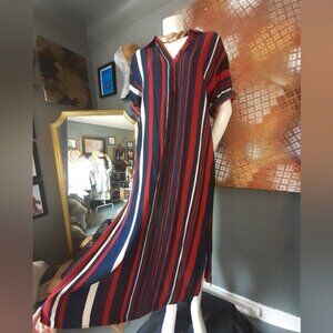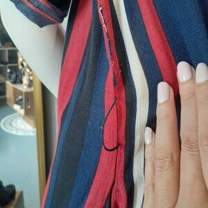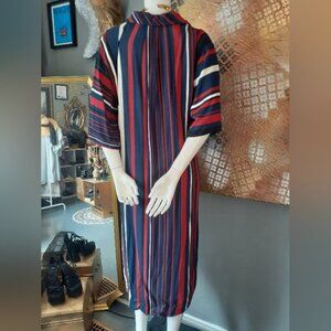 Elegant and stylish, this striped midi dress from Zara features a blend of navy, cream,, black and red hues. Perfect for any occasion, it offers a comfortable fit with a chic design. Tunic silhouette with 34 t shirt style sleeves and buttons to mid chest. Side vent details with front pockets. viscose. Belt has been removed but still has belt loops, see pics for reference.