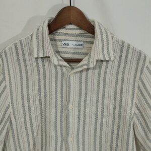 Easy, breezy style from Zara. This short sleeve button-down shirt features a lightweight linen blend fabric with vertical stripes in neutral tones (cream, grey, and subtle blush). Cropped length with a raw fringe hem gives it a modern, effortless vibe — perfect for summer styling.