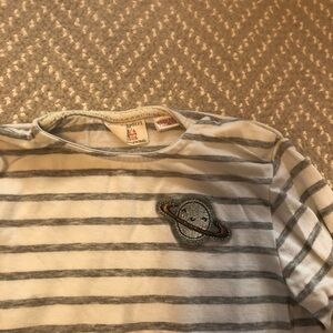 Zara Gray + White Striped Long Sleeve Tee. Planet decal. Button up behind the neck. Size 3/4