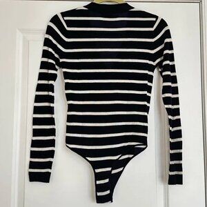 This Zara bodysuit features a classic black and white striped pattern with a deep V-neckline. Part of the Knitwear Collection, it combines comfort and style, making it perfect for both casual and formal outfits. The long sleeves and snap closure ensure a secure and flattering fit.
