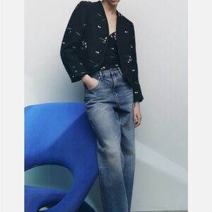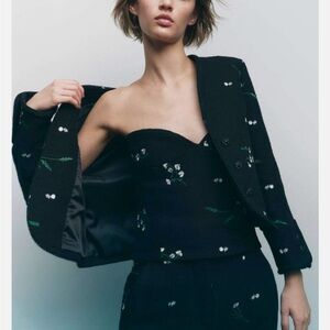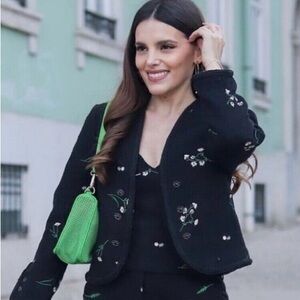 Zara Structured Embroidered Blazer Jacket Size Small Black Floral Feminine