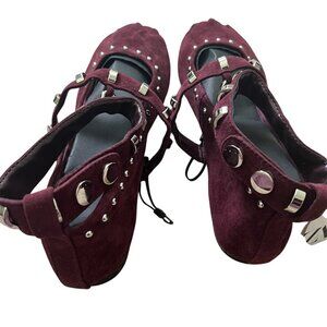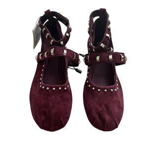 Zara Studded Suede Ballet Flats - Burgundy Red - Size 10 - Ankle Strap - Chic