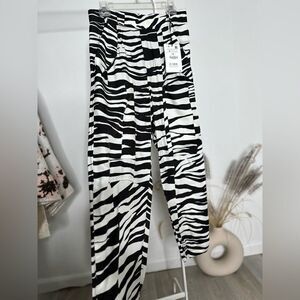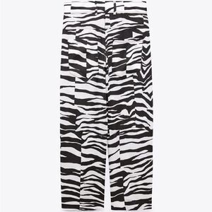 Fluid high rise printed pants. Side pockets. Front and back patch pockets. Front zip, button, and metal hook closure.