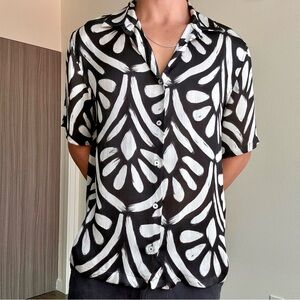Elevate your wardrobe with this chic black and white top. Perfect for any occasion, this stylish piece offers a modern look with its bold pattern.