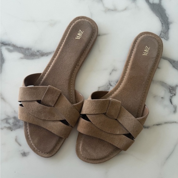 Zara Suede-look Tan Woven Slide Sandals