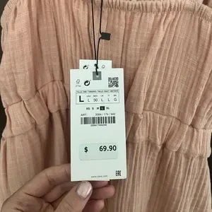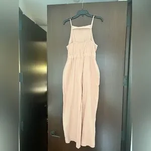 Zara summer romper in lightweight woven gauze fabric. Peachy/pink color. Low back. Wide cropped leg. Attached belt that ties in front. Wide cropped leg. Never worn. Tags on!