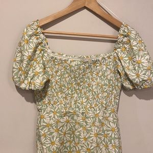 Zara Sunflower White Green Puff Sleeve Rouched Mini Summer Dress