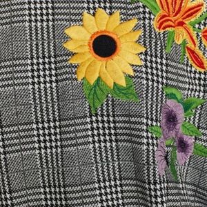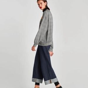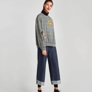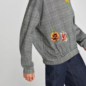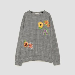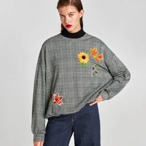 Sweatshirt falling below the hip with round neckline, long puffy sleeves, elastic cuffs and hem and embroidery detail. Made with printed fabric. HEIGHT OF MODEL 181 cm. / 5′ 11″
