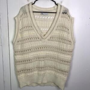 Zara Sweater Vest Womens Small Pointelle Knit Academia Oversized Deep V Neck