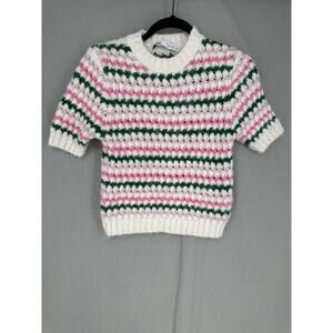 Zara Sweater Womens Small Pink Striped Green Open Knit Short Sleeve Soft Cozy