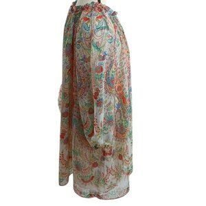 Gently Used. V-Neck Has Some Frayed Fabric Noted In Photo. Colorful, Lined, Elastic Cuff Sleeves, Floral, Semi Sheer. Measurements: Length 33", Pit-to-Pit 25"